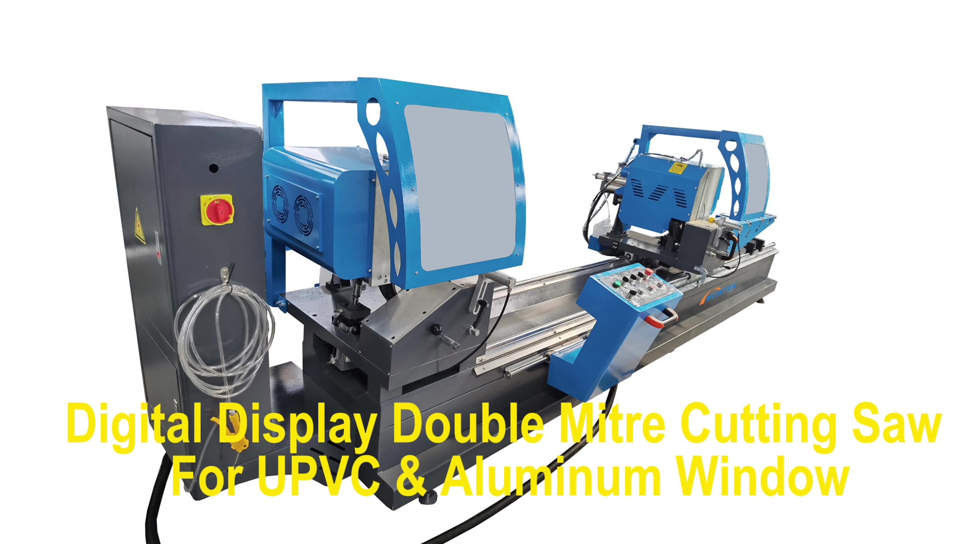 Double heads aluminium window cutting saw machine is not only used for aluminum door and window profiles, but also for cutting UPVC door and window profiles. Its saw blade diameter is 450mm, and it uses a special carbide saw blade that can cut 45 degrees and 90 degrees (swing angle method: manual or pneumatic)